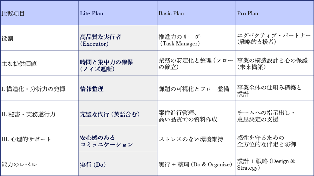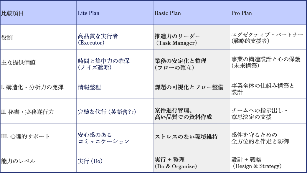 Pro Planをご契約いただくことは、単に業務を任せるだけでなく、13年のプロ経験を持つ私の「戦略的思考」と「構造設計能力」、そして「メンタル面への深い理解」を、あなたの事業の土台に組み込むことを意味します。Basic Planまでは「業務の質を高める」ことに重点を置きますが、Pro Planでは「事業全体の構造と、経営者の世界観を守る」ことを最大の責務といたします。